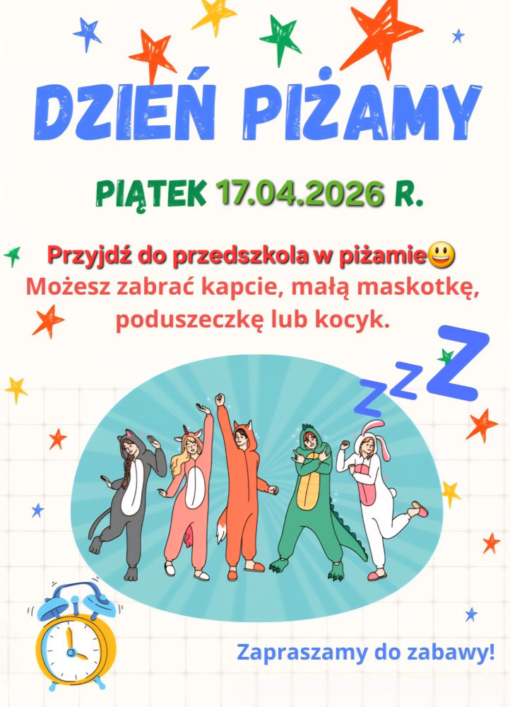 17 kwietnia w naszym przedszkolu organizujemy Dzień Piżamy. Tego dnia dzieci mogą przyjść w szeroko rozumianym stroju piżamowym – piżamie, szlafroku, kapciach, a także z ulubioną maskotką lub kocykiem.